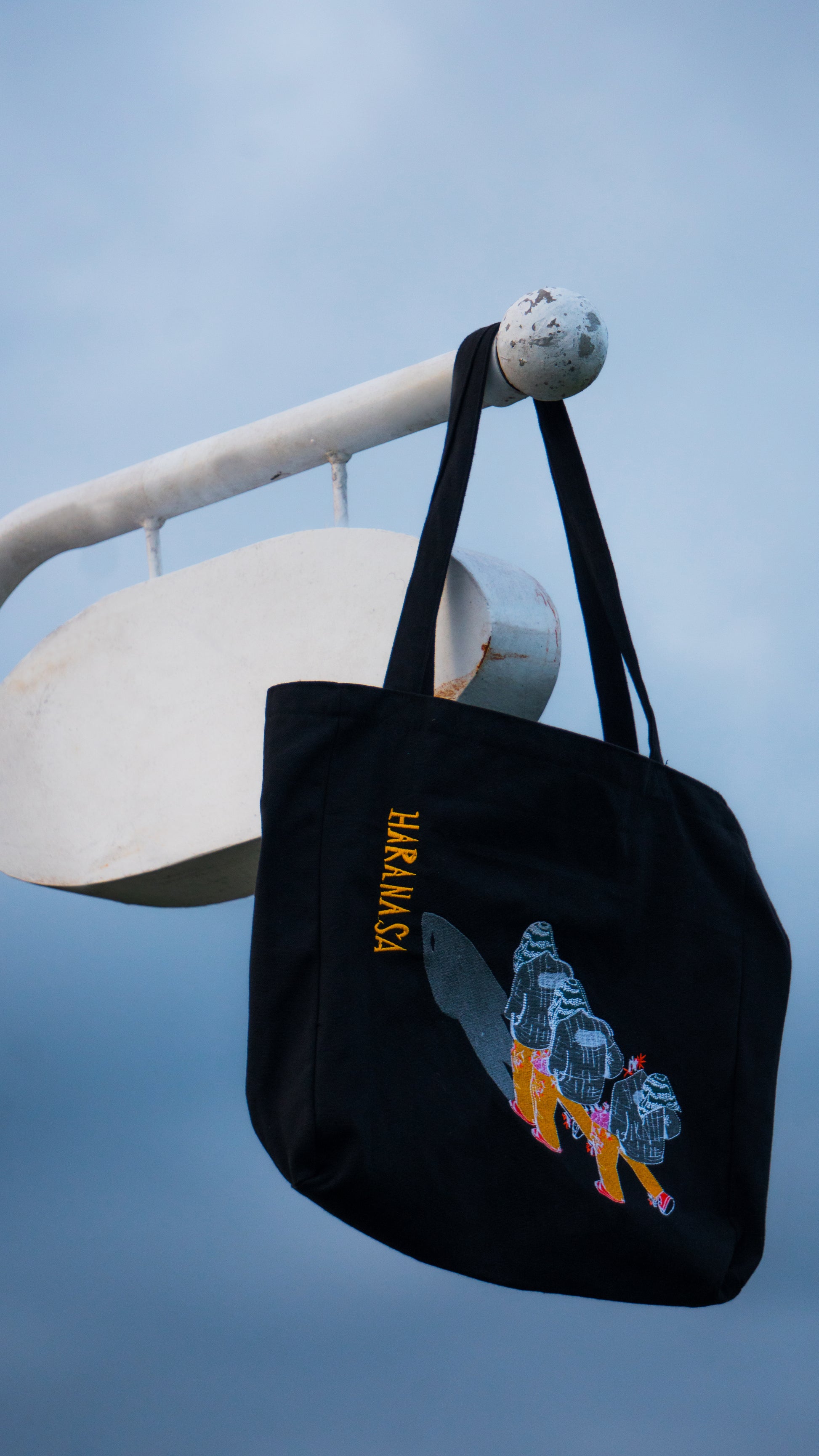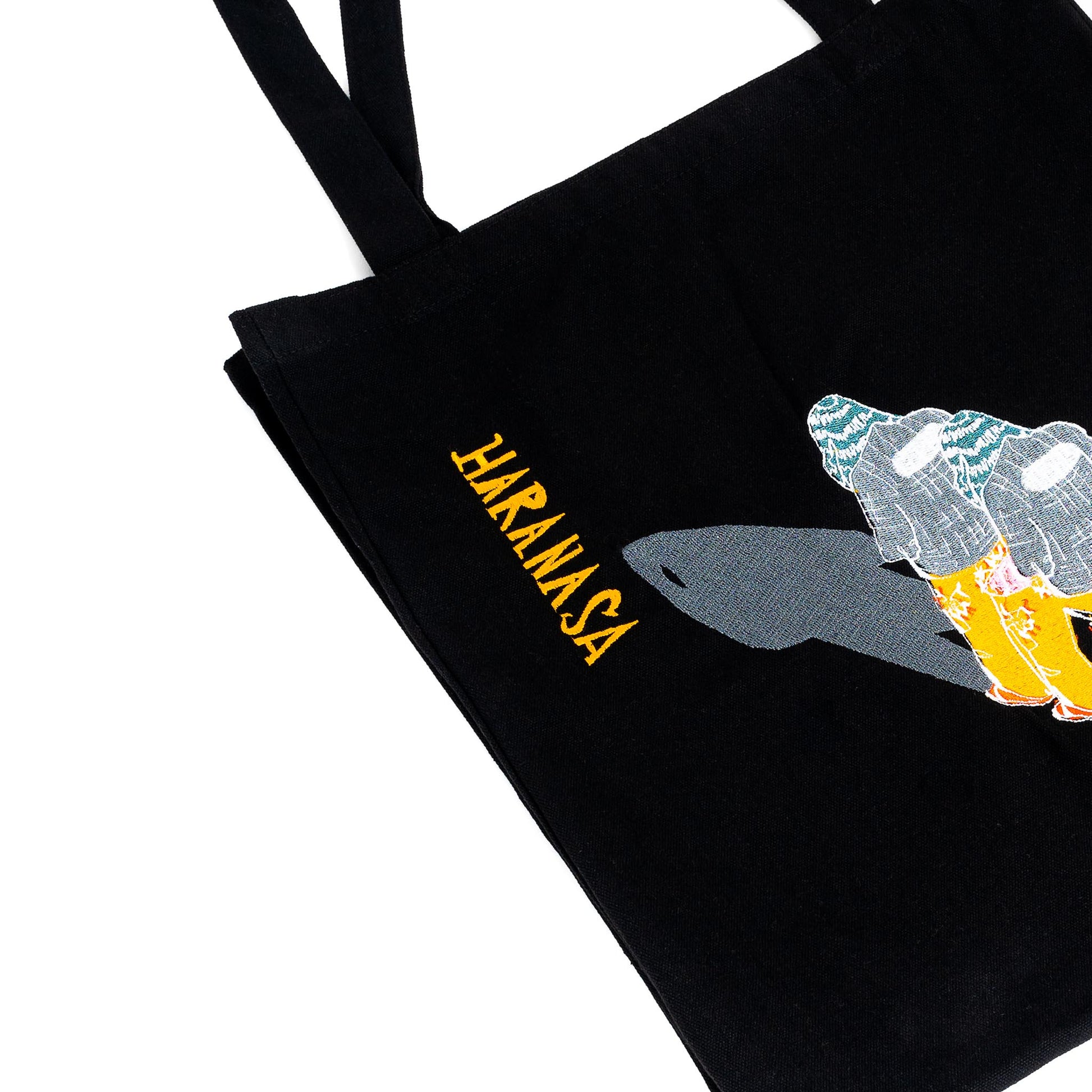 Crafted with reinforced stitching and long handles for comfort, this tote is perfect for daily use — whether you're hitting the market, heading to class, or just carrying your essentials in style. The vivid artwork pops against the deep black fabric, while the vertically placed HARANASA logo in bright yellow adds a contemporary edge.