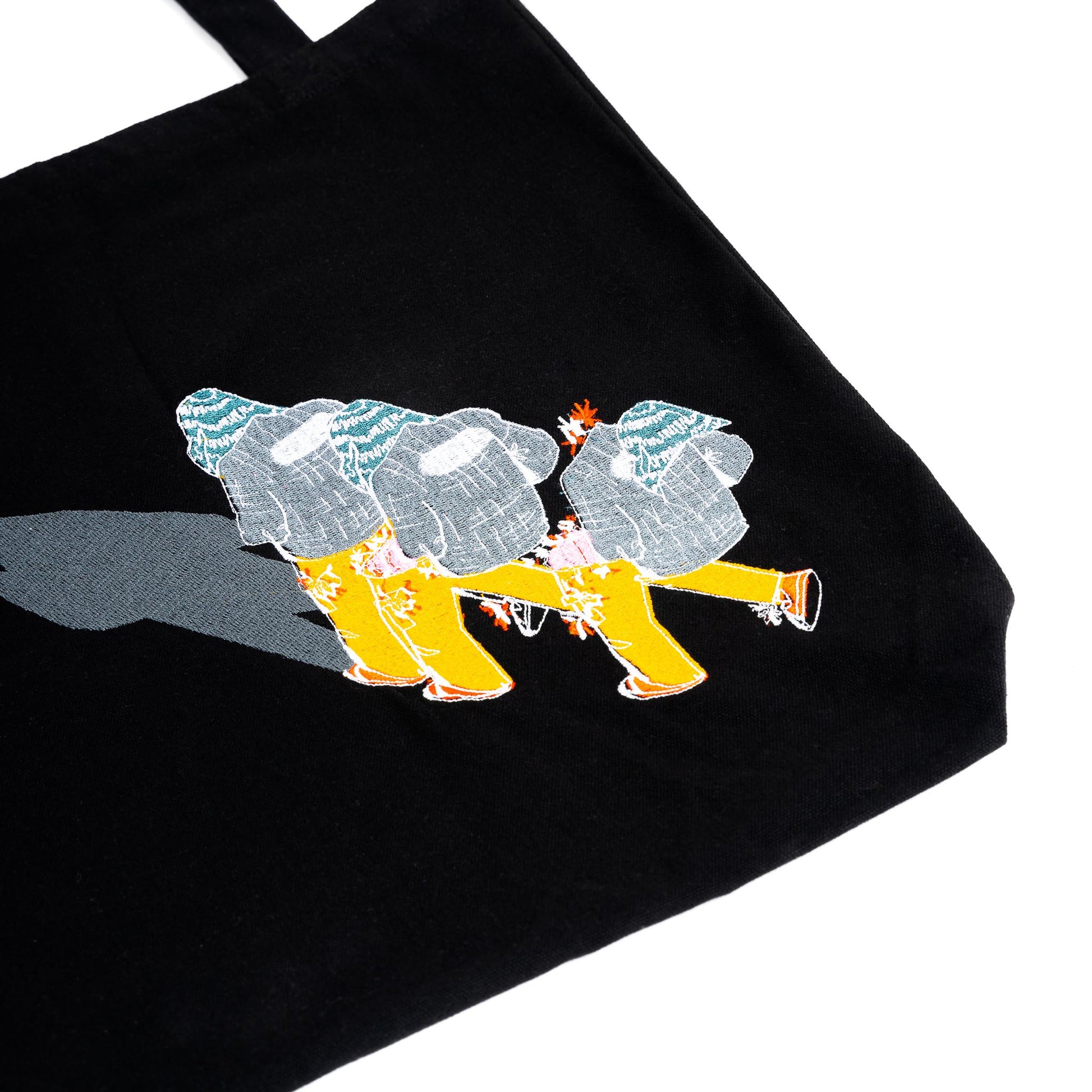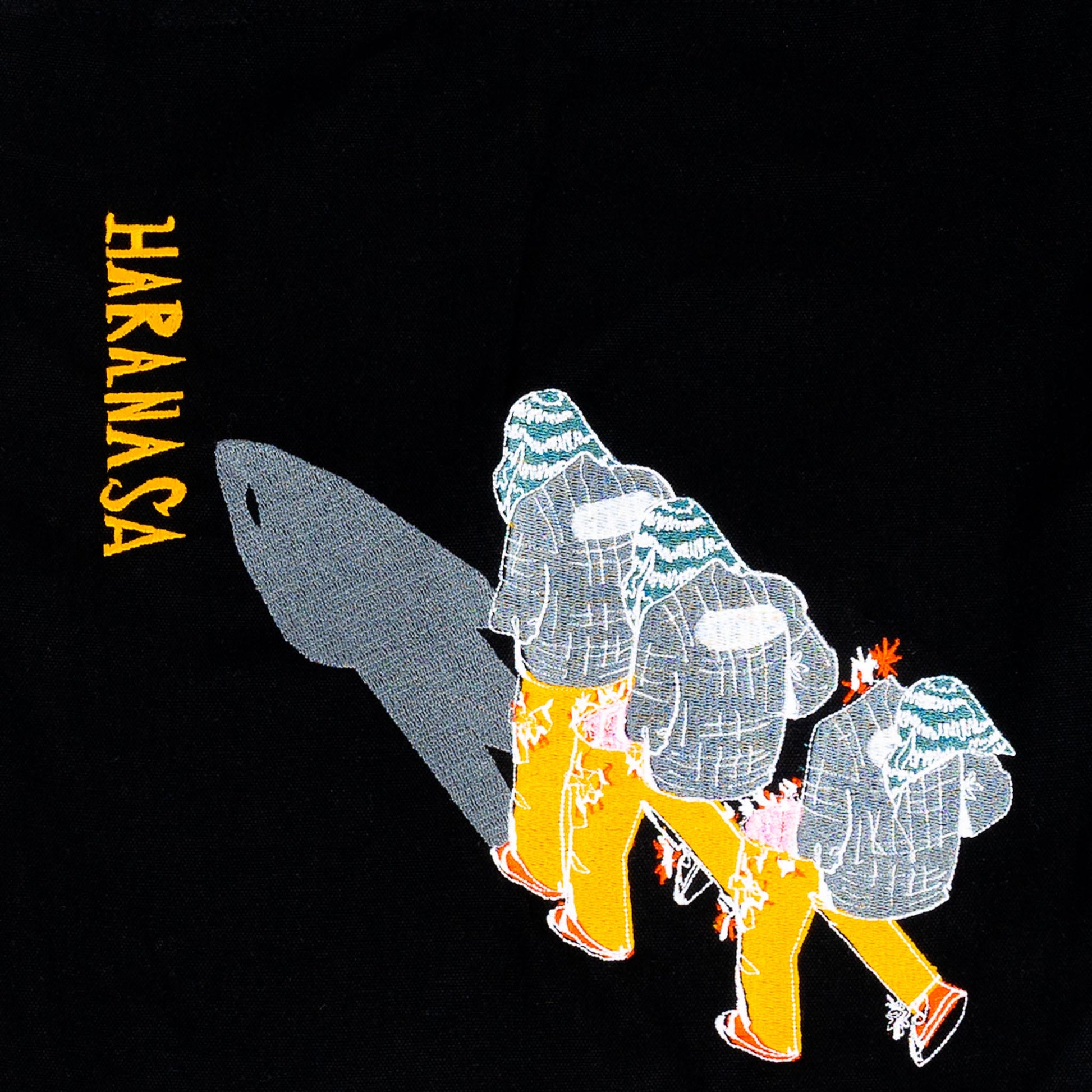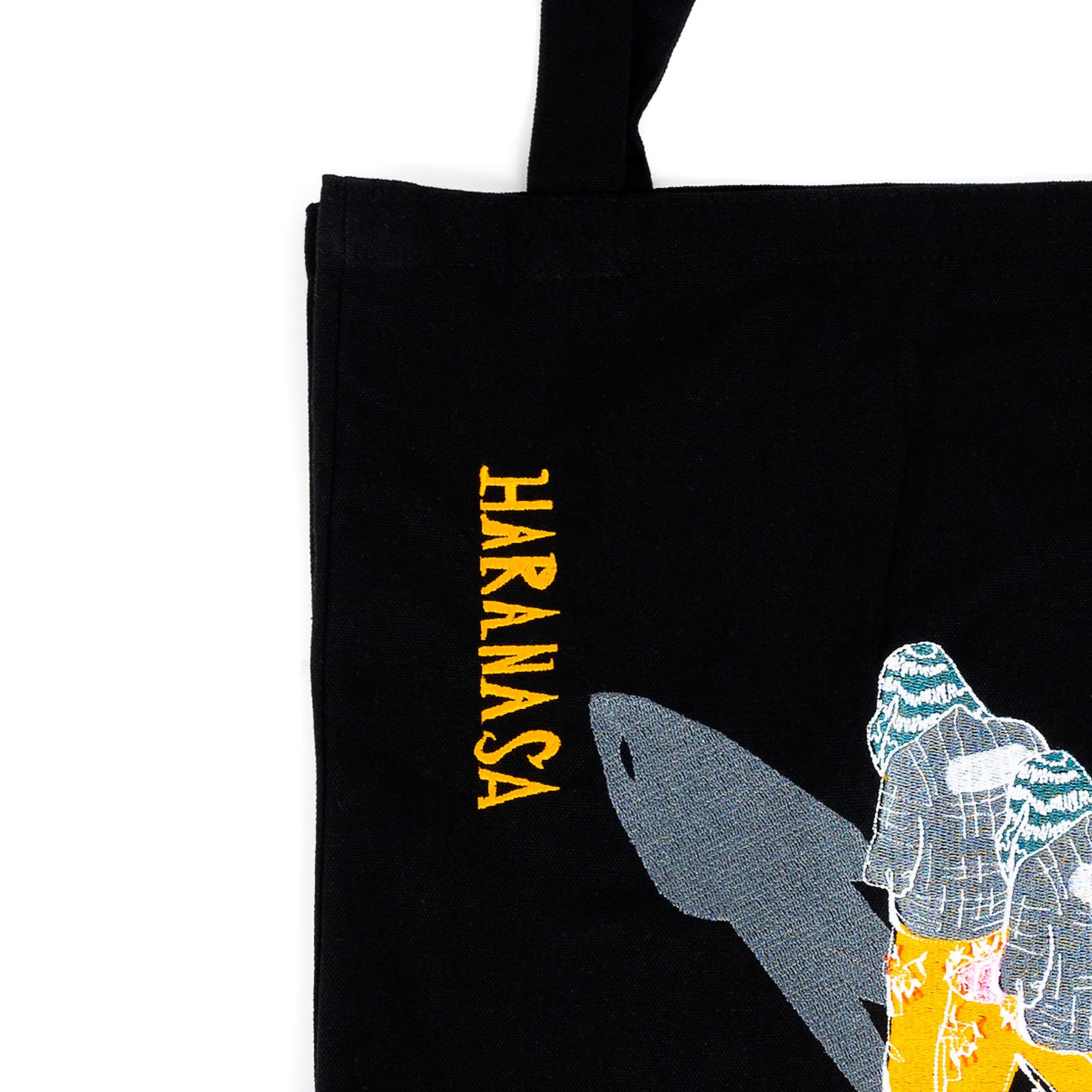 Step into bold artistry with the HARANASA Tote in classic black. This sturdy cotton canvas bag is more than just a carry-all — it's a wearable piece of narrative art. The embroidered design features a line of figures walking in unison, their vibrant yellow pants and unique detailing punctuated with hand-stitched orange blossoms. A large, shadowy fish looms ahead, adding intrigue and contrast to the piece.